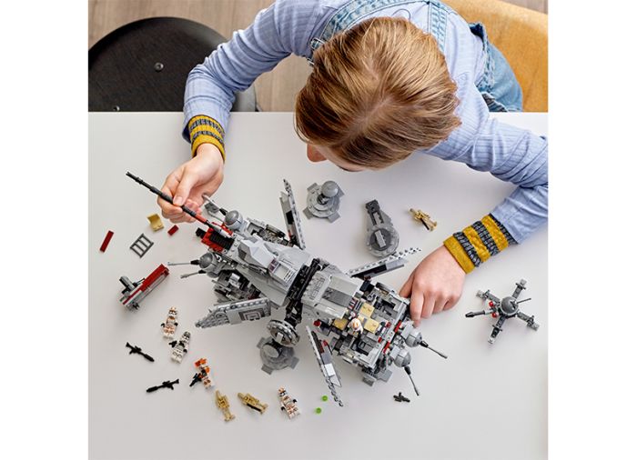 - Playful features – A 360-degree-rotating elevating heavy blaster cannon with 2 stud shooters and a seat for the 212th Clone Gunner, 6 blaster cannons, 2 thermal detonator elements and more