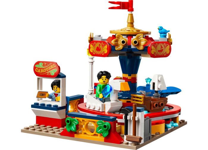 - 3 minifigures – A ticket seller, plus a boy with an ice cream and a girl with a camera who can travel inside the carousel’s carts