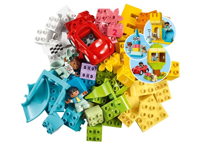 - The colorful assortment of bricks, pieces, number and people are conveniently stored in a yellow storage box with a DUPLO® style 8-stud lid. Combine the contents with other DUPLO sets for even more fun.