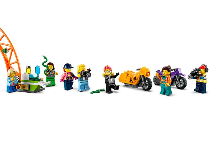 • What’s in the box? – This toy stunt arena includes an arched entrance, snake loop, fire loop, wall of flames, monster truck, vendor stall, spectator stand, 2 stunt motorbikes and 7 minifigures