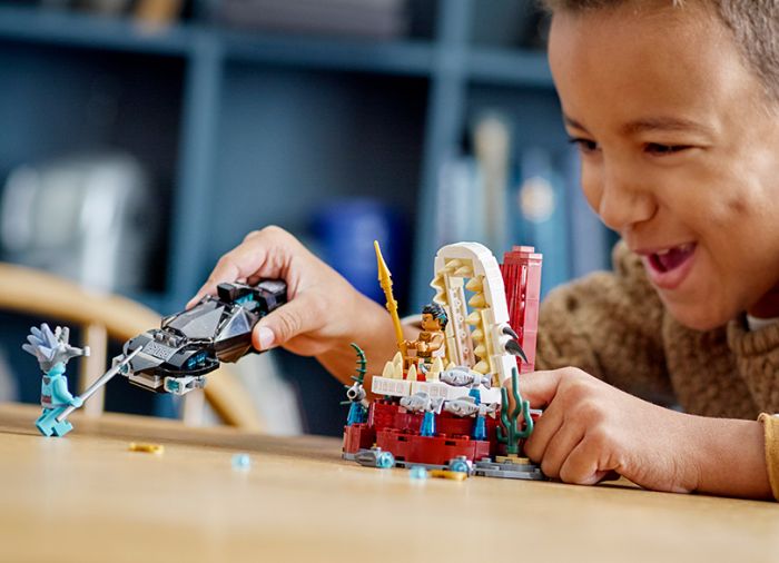 Imaginative underwater action awaits young Super Heroes aged 7 and up in the LEGO® Marvel King Namor’s Throne Room (76213) set. Submarine adventures for Black Panther fans The sleek and stylish recreation of the Skirmisher submarine from Marvel Studios’ Black Panther: Wakanda Forever features stud shooters that kids can fire as they battle the villain Attuma. At the end of the sub’s journey, they’ll discover the Temple of King Namor and the King’s seaweed-decorated throne room. When this mission is over, kids return to the submarine and set off on the next of many more underwater adventures. The set includes 3 minifigures – Shuri, Attuma and King Namor – along with their cool weapons and accessories.