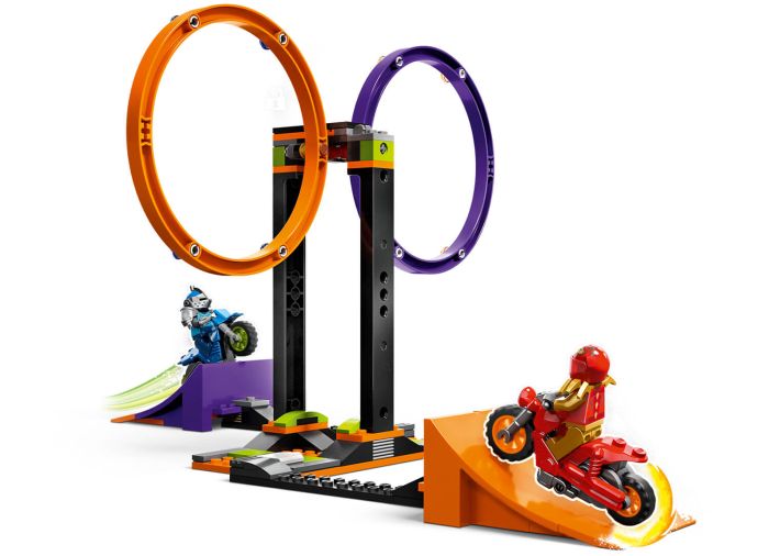 - What’s in the box? – Includes a double stunt ring, 2 jump ramps, 2 flywheel-powered stunt motorcycles and 2 rider minifigures