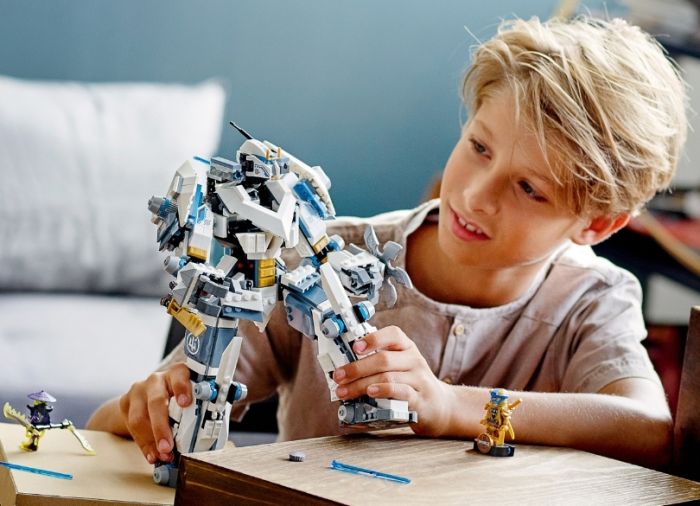 - LEGO® NINJAGO® Legacy Zane’s Titan Mech Battle (71738) is a modern update on a classic playset featuring a highly posable, chainsaw-wielding mech toy for kids to stage thrilling battles.